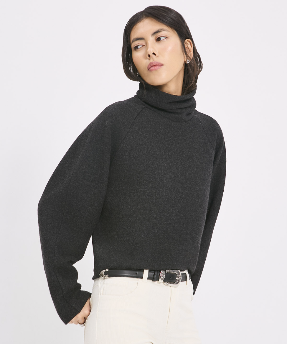 Свитер умеренного объема с заужением к низу, длиной выше линии бедер. Горловина с отрезным воротником-стойкой.